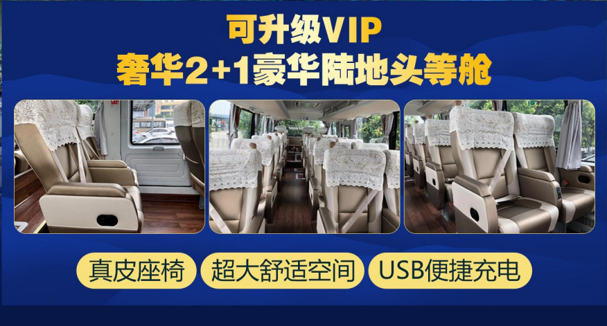 B:豪华头等舱 2+1,真皮座椅,独立安装,独立自由调节,每排座位仅 3 座,全车配 USB 充电接口/充电宝(头舱车型