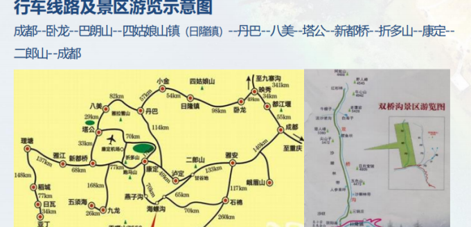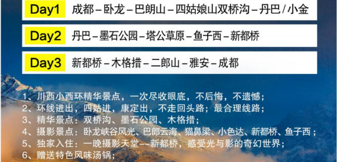 ● 集合时间:06:40 集合,07:00 出发; ● 集合地址:成都市金牛区蜀汉路大润发超市旁 ● 散团地址:回程一般 19:00 左右在创业路诺亚方舟进城方向散团 ● 出行通知:出发前 1 天下午 18:00--21:00 导游或司机以短信形式通知,请保持电话畅通。 内容为:集合时间、地址、车牌、导游/领队或司机电话,及旅途温馨提示,收到通知短信 后请立即回复自己和同行者的名字,并提醒同行者查看,谢谢配合! ● 温馨提示:若晚上 8 点(节假日 9 点)还未收到通知短信或电话,请联系报名处(时间 未到请不要担心,正在积极联系中) 行程安排: Day1 成都—卧龙—巴朗山—四姑娘山双桥沟—丹巴/小金 景点:卧龙峡谷风光、巴朗山云海、猫鼻梁观景、四姑娘山双桥沟 用餐:晚餐住宿:丹巴县城/小金 必须自费:双桥沟观光车 70 元/人; ● 早上 07:00 成都指定地点统一集合出发,经都江堰、紫坪埔水利工程,沿岷江而上,经都 汶高速抵映秀,沿途感受 2008 年汶川大地震“地动山摇、山崩地裂、沧海桑田”后的景象, 感悟大自然的力量;观看震后统一重建的具有民族特色的民居,感受人定胜天的伟力。 而后从映秀出经卧龙自热保护区,沿卧龙峡谷,欣赏峡谷小桥、流水、枯藤、老树的美丽 风光; 而后穿越巴郎山隧道(全长 7954 米),可观云海、映山红、红白杜鹃花、松萝、高山草甸等;观看植物从常绿阔叶林到高山荒漠的垂直变化,感受“一山观四季、十里不同天” 的气象变迁。● 猫鼻梁(约 20 分钟)观四姑娘山全景,尽情摄影后,抵日隆后推荐午餐或 AA 制,自主选择!● 午餐后游览【双桥沟】(观光车 70 元/人,自理),观阴阳谷、五色山、日月宝镜、人参果坪、沙棘林栈道、撵鱼坝、猎人峰、牛棚子、牛心山、阿妣山、野人峰等, 双桥沟景区开阔平坦、景点集中,全程通车。沟内以山景为主,沿沟 216 平方公里范围内,次第分布着几十座海拔在 5000 米上的山峰,会同山涧溪流,如同徐徐展开的山水画廊。沟内还分布着目前国内罕见的千年原始沙棘树林,以及平坦宽阔的高山草甸,夏季,各色花卉装簇其间,香飘数里,漫步其中,宛若置身仙境。沟内现已开通绿色环保的观光车,游客可以更加舒适、方便的游览整个景区。 ● 傍晚经水果之乡小金入住酒店或前往东女国故里千碉之国丹巴,入住酒店。 友情提示:若因政策、道路、大雪等不可抗力因素导致不能走小金进入,行程改成:成都-雅安-泸定--丹巴-(瓦丹路进入),双桥沟门票费用按旅行社折扣价格退费,敬请知晓! Day2 丹巴—墨石公园—塔公草原—鱼子西—新都桥 景点:亚拉雪山观景台、惠远寺、墨石公园、塔公草原、尼玛河谷、鱼子西 用餐:早、晚餐 住宿:新都桥 -必须自费:墨石观光车20元/人,鱼子西中转车60元/人 ● 早餐后告别东女故都--丹巴,打卡【亚拉雪山观景台】,远观雅拉雪山;● 前往十一世达赖降生地-【惠远寺】惠远寺经 3 次重建,新建庙宇为宫殿式金瓦顶楼,配以金幢宝瓶,法轮异兽,彩绘历代帝王及战将,各种唐卡画,活佛神像于檐檩之上;浮雕九龙九狮门枋,肥梁胖柱,铺陈富丽;庭院宽敞,布局严谨;楼堂庭廊,和谐得体。殿宇建筑豪华,具地方特色,为康巴建筑艺术精品。该寺现收藏有各种贵重文物多件,寺庙每年为种种祭祀活动念经 245 天,大的法会有正月的“默朗钦布”,六月的“亚却”和十一月的“安却”。每逢法会,各地的信徒都前来朝拜、颂经,热闹非凡。● 到达八美,参观网红打卡地【墨石公园】(观光车 20 元/人,自理),感叹大自然的鬼斧神工;步入墨石公园,传说当年格萨尔王王妃珠姆在此游玩之时,不小心掉下一条丝巾,落在这片格萨尔王战斗过的土地上,变成了卡玛河,滋润着这片石林及当地的人们。石林含钙盐,受空气湿度的影响,干燥季节呈浅灰色、浅蓝色,湿润季节呈苍黑色,又称之为变色石林。● 然后到达【塔公草原】(门票20元/人,自理)自由游览(约30分钟),沿线的河流、草原、森林、山体、寺庙、藏房建筑和浓郁的藏乡风情,犹如走近画中世界一般。● 在塔公或新都桥换乘当地中转车(中转车费60元/人,自理)(从新都桥镇前往鱼子西需要换乘当地中转小车,如出团为17座以下商务车,如司机愿意可以原车摆渡,但仍需支付中转车费用)前往【鱼子西】(管理服务费20元/人,自理),鱼子西属于木雅贡嘎地区,拥有 以藏传佛教为基础的基本文化特征,项目范围内可360度遥望藏区四大神山之一藏区“第二香巴拉”的雅拉神山全貌和四川最高峰“蜀山之王”的木雅贡嘎大雪山山系全貌,为贡嘎西坡地区难得的观景摄影点。随后返回随后前往“光与影的世界”摄影天堂新都桥,感受那狂野的川西高原与藏式村寨的独特融合,让你走进一片如诗如画的世外桃源。● 入住新都桥。特别注意事项: 1、高原天气变化大,山路比较多,路况不确定(政府交通管制,下雨,下大雪容易堵车), 导游有权根据当天路况及天气调整景区游览顺序,如因不可抗力因素导致去不到鱼子西, 无任何费用退还。或可改成其他类似观景平台,如:八郎生都村、格底拉姆天空之城等等; 费用另算! 2、藏区条件有限,伴有停电停水现象发生,敬请理解!【温馨提示】前往鱼子西游览期间属于自由活动,无导游陪同,自由活动期间安全自负! Day3 新都桥—木格措—二郎山—雅安—成都 景点:木格措、大渡河、二郎山 用餐:早餐 必须自费:木格措观光车 90 元/人 ● 早餐后,前往有小九寨之称的【康定情歌风景